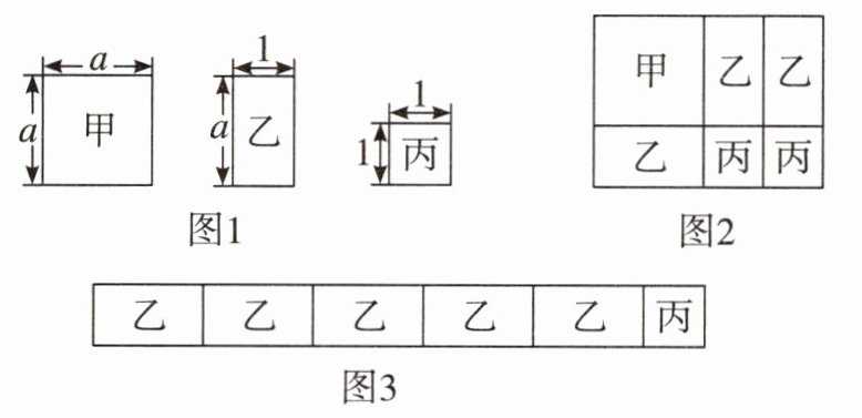 (1)依题意得,三种长方形卡片的面积分别为$S_{甲}=a^{2},S_{乙}=a,S_{丙}=1$,所以$S_{1}=S_{甲}+3S_{乙}+2S_{丙}=a^{2}+3a+2,S_{2}=5S_{乙}+S_{丙}=5a+1$,所以$S_{1}+S_{2}=(a^{2}+3a+2)+(5a+1)=a^{2}+8a+3$,所以当$a=2$时,$S_{1}+S_{2}=2^{2}+8×2+3=23.$