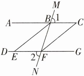 20. (10分)如图,直线MN分别与直线AC,DG交于点B,F,且$∠1=∠2$,$∠ABF$的平分线BE交直线DG于点E,$∠BFG$的平分线FC交直线AC于点C.