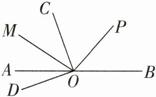 1. 如图,已知点O为直线AB上一点,$\angle BOC=100^{\circ}$,$\angle COD=90^{\circ}$,OM平分$\angle AOC$。