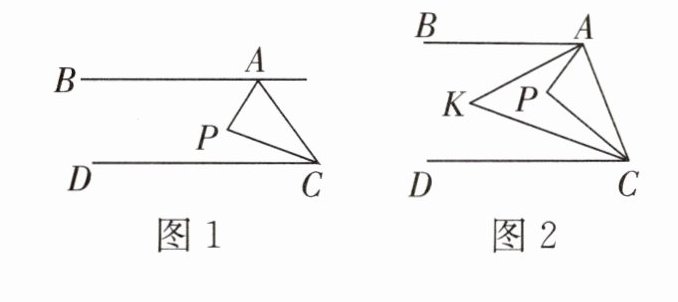 (2)∠AKC = $\frac{1}{2}$∠APC.理由:如图2,过K作KE//AB,因为AB//CD,所以KE//AB//CD,∠AKE = ∠BAK,∠CKE = ∠DCK,所以∠AKC = ∠AKE + ∠CKE = ∠BAK + ∠DCK.过P作PF//AB,同理可得,∠APC = ∠BAP + ∠DCP.因为∠BAP与∠DCP的角平分线交于点K,所以∠BAK + ∠DCK = $\frac{1}{2}$∠BAP + $\frac{1}{2}$∠DCP = $\frac{1}{2}$(∠BAP + ∠DCP) = $\frac{1}{2}$∠APC,所以∠AKC = $\frac{1}{2}$∠APC.