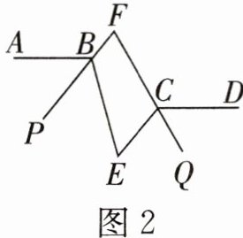 (2)①∠E + 2∠F = 180°,证明如下:延长AB交FQ于M,延长DC交BE于N,如图2.因为射线BP,CQ分别平分∠ABE,∠DCE,所以∠ABP = ∠EBP,∠DCQ = ∠ECQ.设∠ABP = ∠EBP = α,∠DCQ = ∠ECQ = β,所以∠FBM = ∠ABP = α,∠MBE = 180° - 2α,∠NCE = 180° - 2β,∠FCN = ∠DCQ = β.因为AB//DC,所以∠FMB = ∠FCN = β,∠CNE = ∠MBE = 180° - 2α,所以∠F = 180° - ∠FBM - ∠FMB = 180° - (α + β),∠E = 180° - ∠NCE - ∠CNE = 180° - (180° - 2β) - (180° - 2α) = 2(α + β) - 180°,所以∠E = 180° - 2∠F,所以∠E + 2∠F = 180°.