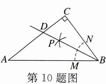 10. (黄石)如图, 在 $ \mathrm{Rt} \triangle A B C $ 中, $ \angle A C B= 90^{\circ} $, 按以下步骤作图: (1)以 $ B $ 为圆心, 任意长为半径作弧, 分别交 $ B A, B C $ 于 $ M, N $ 两点; (2)分别以 $ M, N $ 为圆心, 以大于 $ \frac{1}{2} M N $ 的长为半径作弧, 两弧相交于点 $ P $; (3)作射线 $ B P $, 交边 $ A C $ 于 $ D $ 点. 若 $ A B= 10, B C= 6 $, 则线段 $ C D $ 的长为 (
