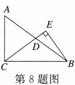8. (包头)如图, 在 $ \mathrm{Rt} \triangle A B C $ 中, $ \angle A C B= 90^{\circ}, D $ 是 $ A B $ 的中点, $ B E \perp C D $, 交 $ C D $ 的延长线于点 $ E $. 若 $ A C= 2, B C= 2 \sqrt{2} $, 则 $ B E $ 的长为 (