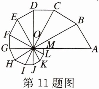 11. (烟台)由 12 个有公共顶点 $ O $ 的直角三角形拼成的图形如图所示, $ \angle A O B= \angle B O C=… = $ $ \angle L O M= 30^{\circ} $. 若 $ O A= 16 $, 则 $ O G $ 的长为 (