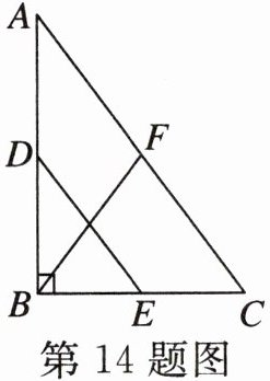 14. (徐州)如图, 在 $ \mathrm{Rt} \triangle A B C $ 中, $ \angle A B C= 90^{\circ} $, $ D, E, F $ 分别为 $ A B, B C, C A $ 的中点, 若 $ B F= $ $ 5 $, 则 $ D E= $______
