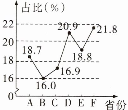 9. (丽水)根据第七次全国人口普查,华东A,B,C,D,E,F六省60岁及以上人口占比情况如图所示,这六省60岁及以上人口占比的中位数是______