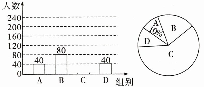 (2) C 组的人数为 400 - 40 - 80 - 40 = 240,补全条形如图所示。