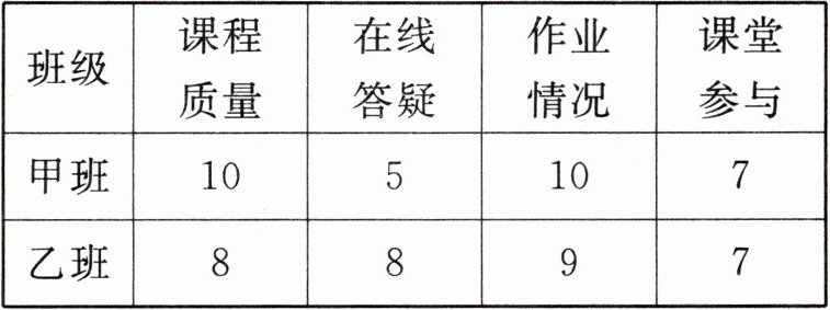 (2)如果A校把“课程质量”“在线答疑”“作业情况”“课堂参与”这四项指标的得分按照2:3:2:3的比例确定最终成绩,请你通过计算判断应推荐哪个班为在线教学先进班级?