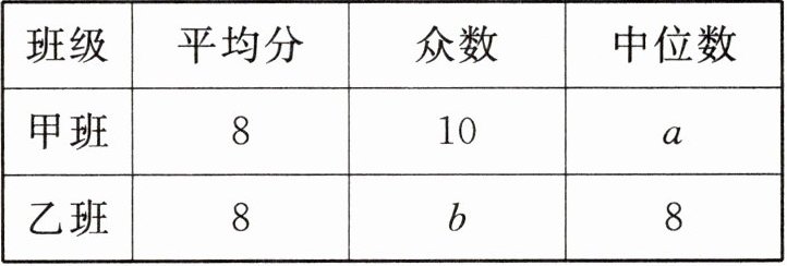 (2) $\overline{x}_{甲} = \frac{10×2 + 5×3 + 10×2 + 7×3}{2 + 3 + 2 + 3} = 7.6$ (分), $\overline{x}_{乙} = \frac{8×2 + 8×3 + 9×2 + 7×3}{2 + 3 + 2 + 3} = 7.9$ (分). $\because 7.6 < 7.9$, $\therefore$ 推荐乙班为在线教学先进班级.