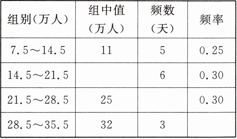(3)该旅游景点 20 天平均每天参观的人数约为 $\frac{11×5 + 18×6 + 25×6 + 32×3}{20} = \frac{409}{20} = 20.45$ (万人), $20.45×180 = 3681$ (万人), $\therefore$ 估计该旅游景点半年的参观总人数约为 3681 万人.