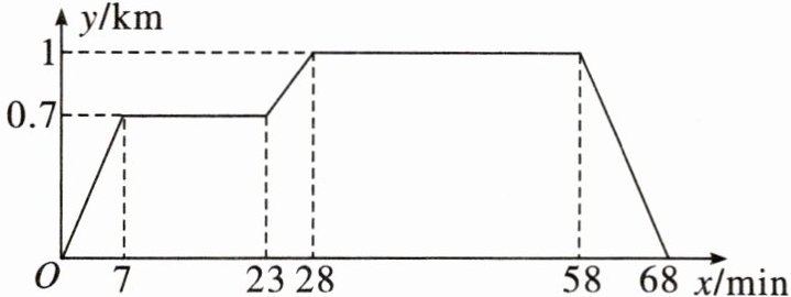 已知小亮所在学校的宿舍、食堂、图书馆依次在同一条直线上,食堂离宿舍0.7km,图书馆离宿舍1km.周末,小亮从宿舍出发,匀速走了7min到食堂;在食堂停留16min吃早餐后,匀速走了5min到图书馆;在图书馆停留30min借书后,匀速走了10min返回宿舍.给出的图象反映了这个过程中小亮离宿舍的距离y(km)与离开宿舍的时间x(min)之间的对应关系.