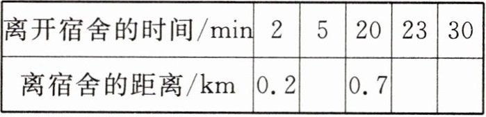 (3)由题图知,当$0≤x≤7$时,小亮速度为 0.1 km/min,故离宿舍的距离为$y=0.1x$;当$7<x≤23$时,小亮在食堂停留,故$y=0.7$;当$23<x≤28$时,小亮以 0.06 km/min 的速度从食堂前往图书馆,故$y=0.7+0.06(x-23)=0.06x-0.68$.综上所述,$y=\left\{\begin{array}{l} 0.1x(0≤x≤7),\\ 0.7(7<x≤23),\\ 0.06x-0.68(23<x≤28).\end{array}\right. $