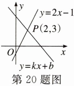 20. (鄂州)数形结合是解决数学问题常用的思想方法.如图,直线$y= 2x-1与直线y= kx+b(k≠0)相交于点P(2,3)$.根据图象可知,关于$x的不等式2x-1>kx+b$的解集是(