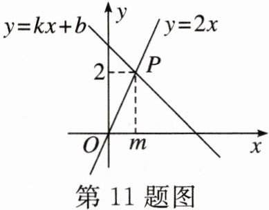 11. (抚顺)如图,直线$y= 2x与直线y= kx+b相交于点P(m,2)$,则关于$x的方程kx+b= 2$的解是(