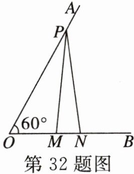 32.如图,已知$∠AOB= 60^{\circ }$,点P在边OA上,$OP= 12$,点M,N在边OB上,$PM= PN$,若$MN= 2$,则$OM= $ (