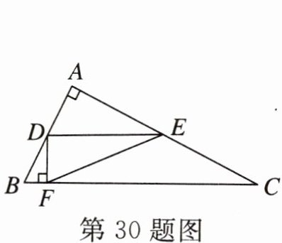 30.如图,在$\triangle ABC$中,$∠A= 90^{\circ }$,D是AB的中点,过点D作BC的平行线交AC于点E,作BC的垂线交BC于点F,若$AB= CE$,且$\triangle DFE$的面积为1,则BC的长为 (