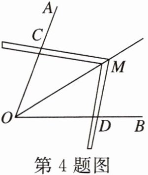 4.(盐城)工人师傅常常利用角尺构造全等三角形的方法来平分一个角.如图,在$∠AOB$的两边OA,OB上分别取$OC= OD$,移动角尺,使角尺两边相同的刻度分别与点C,D重合,这时过角尺顶点M的射线OM就是$∠AOB$的平分线.这里构造全等三角形的依据是 (