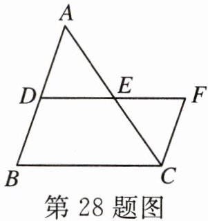 28. 如图,在$△ABC$中,D,E分别为AB,AC的中点,延长DE到点F,使$EF= DE$,若$AB= 10,BC= 8$,则四边形BCFD的周长=