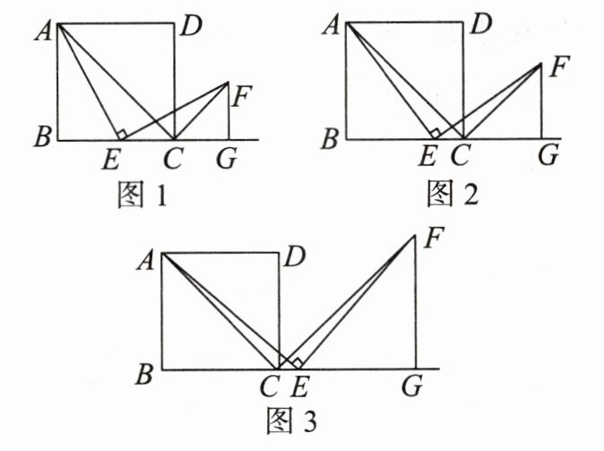(1) $AC = \sqrt{2}(FG + EC)$. 证明: 如图, 在 $AB$ 上截取 $BM = BE$, 连接 $EM$. $ \because $ 四边形 $ABCD$ 是正方形, $ \therefore \angle B = \angle BCD = 90^{\circ}$, $AB = BC$, $ \therefore \angle DCG = 90^{\circ}$, $ \angle EAM + \angle AEB = 90^{\circ}$. $ \because BM = BE$, $ \therefore AB - BM = BC - BE$, $ \angle BME = \angle BEM = 45^{\circ}$, $ \therefore AM = EC$, $ \angle AME = 135^{\circ}$. $ \because CF$ 平分 $ \angle DCG$, $ \therefore \angle FCG = 45^{\circ}$, $ \therefore \angle ECF = 135^{\circ}$, $ \therefore \angle AME = \angle ECF$. $ \because \angle AEF = 90^{\circ}$, $ \therefore \angle FEC + \angle AEB = 90^{\circ}$, $ \therefore \angle EAM = \angle FEC$.