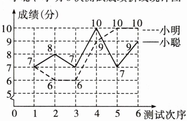 14. (金华)小聪、小明准备代表班级参加学校“党史知识”竞赛,班主任对这两名同学测试了6次,获得如下测试成绩折线统计图.根据图中信息,解答下列问题: