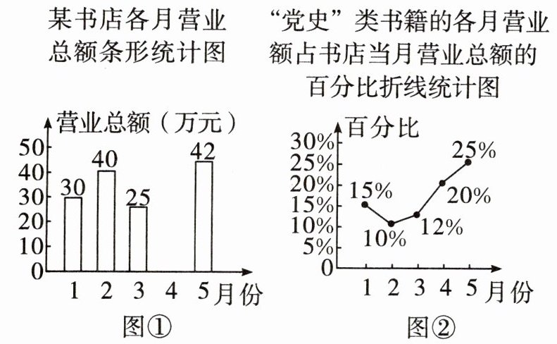 解:由图②知5月份“党史”类书籍的营业额占书店当月营业总额的百分比为25%,5月营业总额42万元。5月份“党史”类书籍的营业额=42×25%=