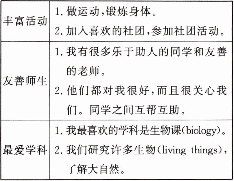 I am Mike, a new student at Sunshine Middle School. I live a happy life here. I do sports and exercise every day. I join my favourite clubs and participate in club activities. I have many helpful classmates and friendly teachers. They all treat me well and care about us. Students also help each other. When I am in trouble, they always help me. My favourite subject is biology. We study many living things and learn about nature. We also understand ourselves better. There are all kinds of clubs in our school. The activities after class make me very happy. I like basketball, so I join the basketball club.