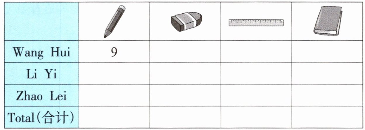 Hello, I'm Wang Hui. I have four erasers, nine pencils, eight books and five rulers.