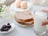 I have a glass of milk, two eggs, some bread, and some grapes for breakfast. They are all yummy and good for my body!
