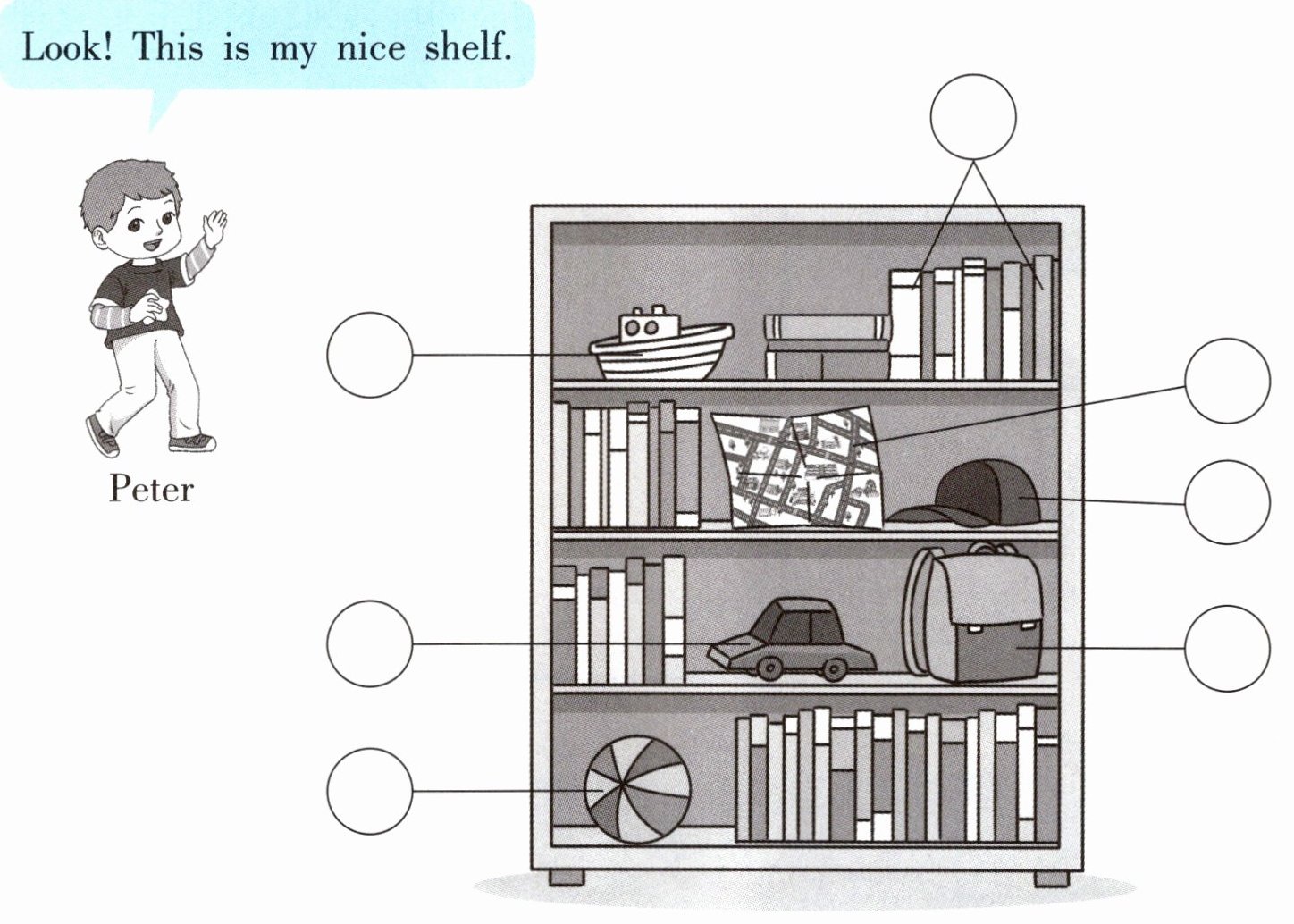二、Look and choose. 下面是 Peter 的书架,上面放了些什么物品呢?请你看一看,选一选,将序号填入相应的圈内。