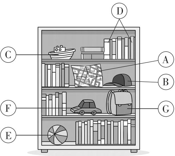 A. map B. cap C. boat D. books E. ball F. car G. bag