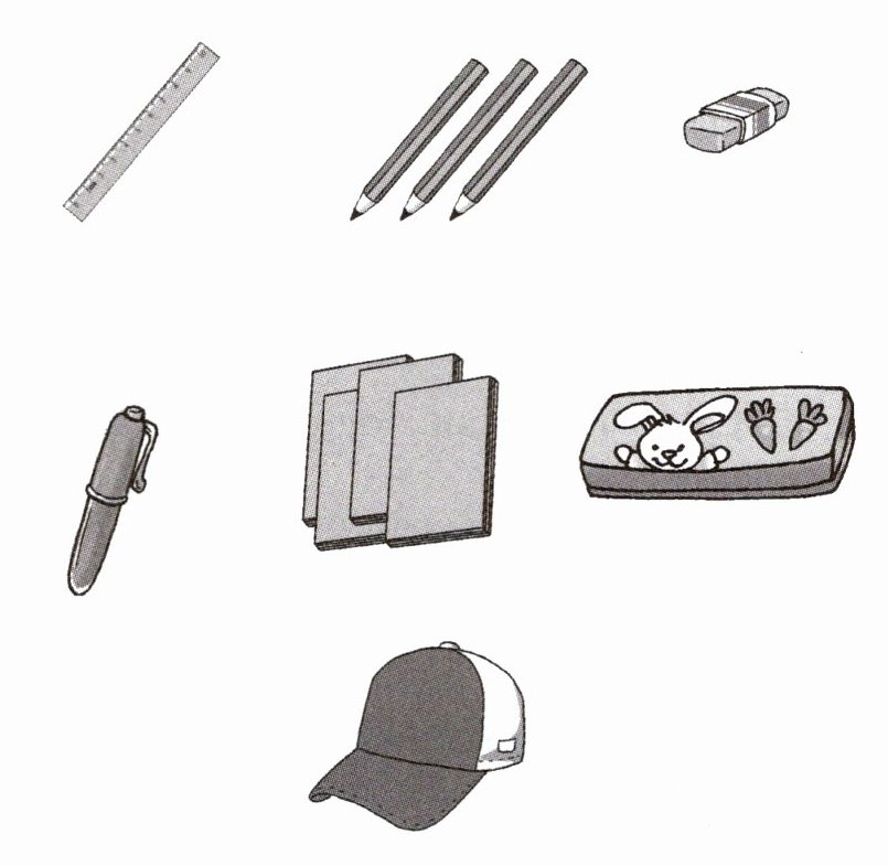 I put a pen, three pencils, an eraser in the pencil box. And put the pencil box, four books in my bag.