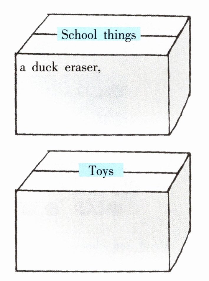 三、Read and write. Nana 马上就要搬家了,她正在打包自己的一些旧物品。请你读一读,照样子将她的旧物品归类写在对应的箱子上。