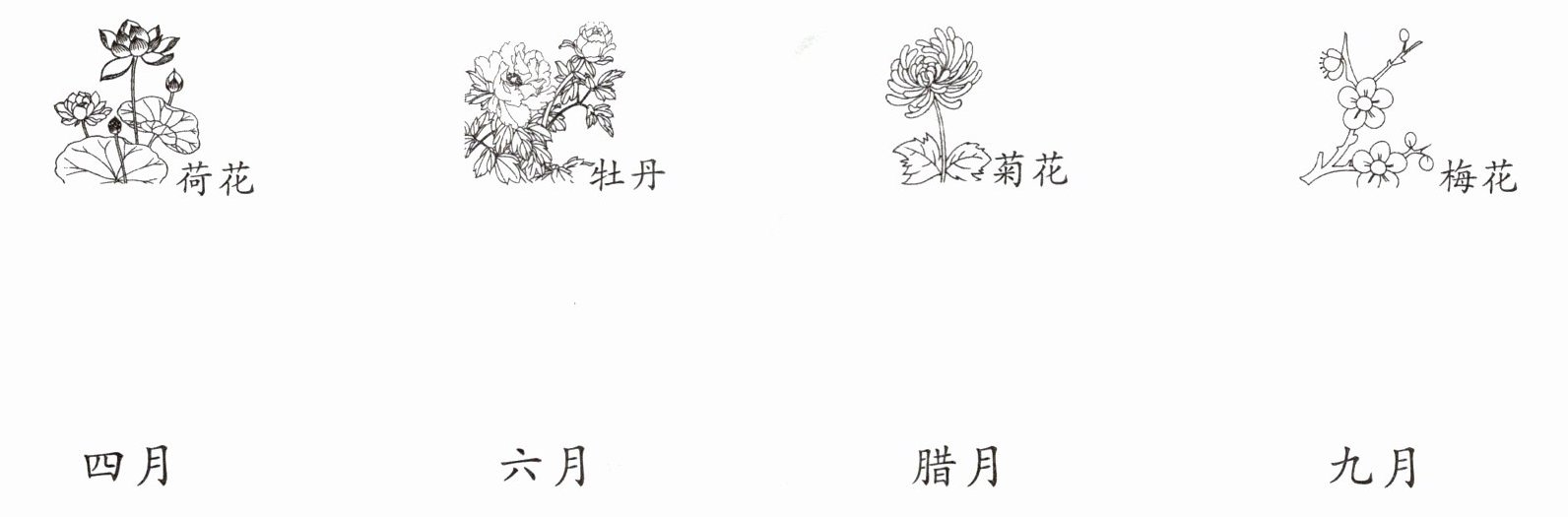 荷花—六月 牡丹—四月 菊花—九月 梅花—腊月