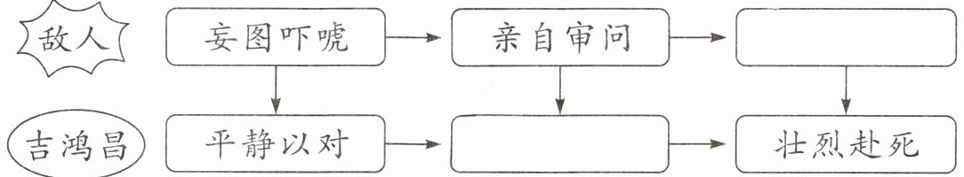 (2)死也要死得光明正大!要给这些反动派看看,共产党员的威严与正气。 他坦然面对死亡 他始终维护共产党的威严 5.义正词严 6."害怕""发抖"是对特务的心理描写和动作描写,这些细节描写写出了特务被吉鸿昌的威严与不屈精神震慑的表现,侧面衬托了吉鸿昌正直不屈、忠于革命、热爱祖国的形象。