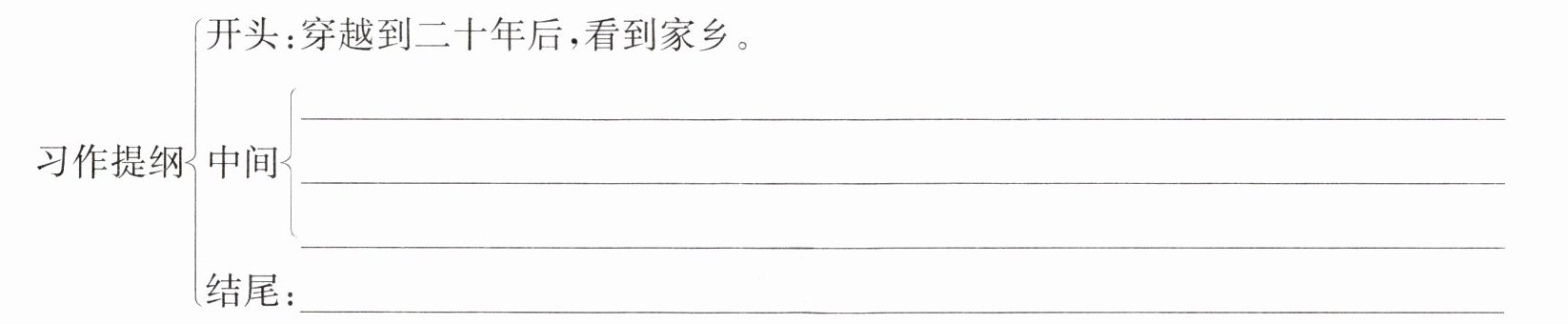 示例:习作提纲{开头:穿越到二十年后,看到家乡。中间{环境变化:受到污染。生活变化:科技发展。身体变化:生各种怪病。结尾:呼吁人类保护环境。