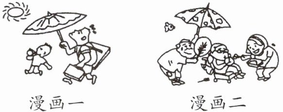 漫画一中,大人为孩子撑伞遮阳,自己却被太阳晒着,体现了父母对孩子无私的爱;漫画二中,人们围绕着老人,有的为老人撑伞,有的给老人扇风,有的递水,展现了对老人的关爱与尊敬。这两幅漫画启示我们:要懂得感恩父母的养育之恩,同时也要学会关爱身边的老人,传承尊老爱幼的传统美德。