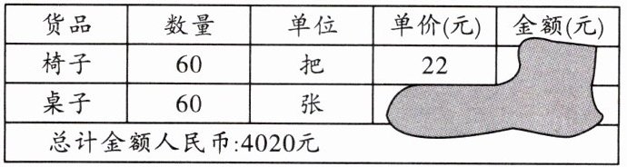 解:设每张桌子 $ x $ 元。 $ 60x + 60 × 22 = 4020 $ $ x = 45 $