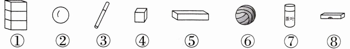 长方体:(①⑤⑧) 正方体:(④) 圆柱:(③⑦) 球:(②⑥)
