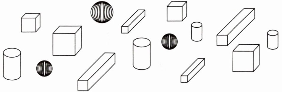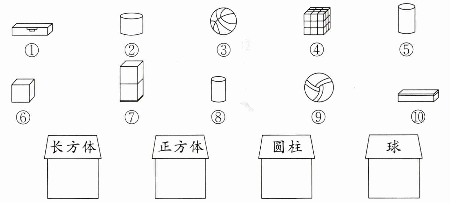 本题可根据长方体、正方体、圆柱和球的特征,对所给图形进行分类。