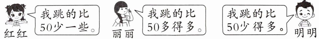 【解析】 分析题意可知,他们所跳的个数都与50相比较。丽丽“跳的比50多得多”,说明丽丽跳绳的个数比50多,红红和明明跳绳的个数都比50少,可以用假设法解决,假设红红跳了49个,比50少一些,明明跳了1个,比50少得多,49>1,所以红红跳得比明明多。所以丽丽跳得最多,明明跳得最少。