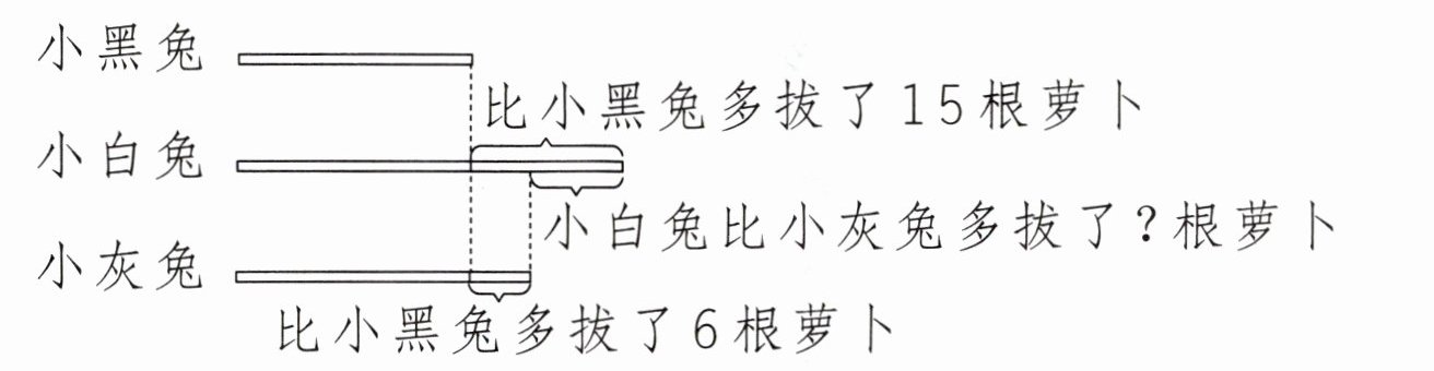 例 2 小白兔比小黑兔多拔了 15 根萝卜,小灰兔比小黑兔多拔了 6 根萝卜,小白兔比小灰兔多拔了几根萝卜?