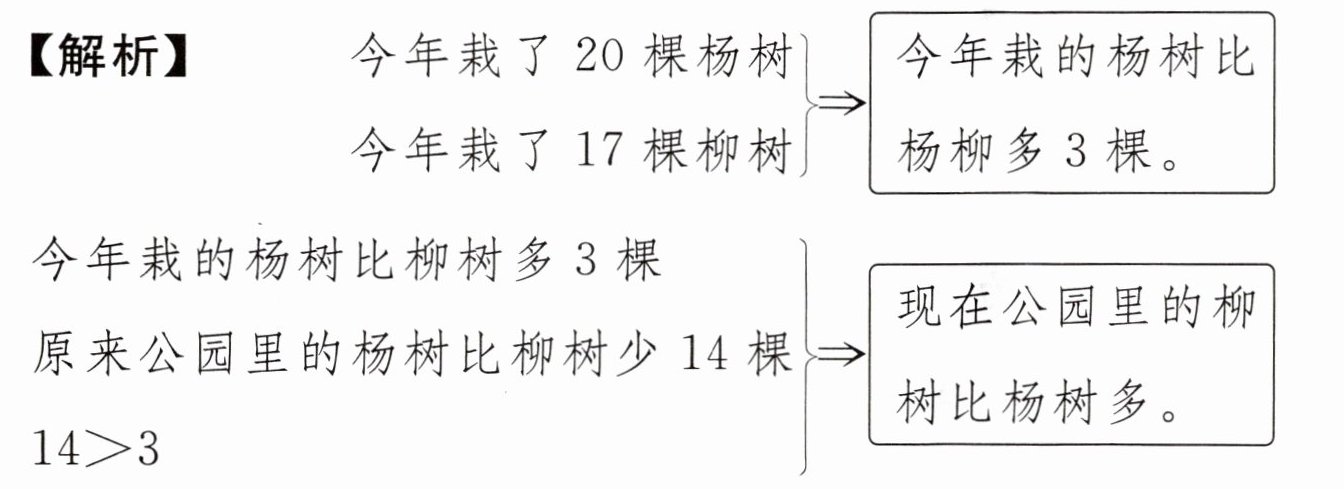 再比较原来杨树比柳树少的棵数和今年杨树比柳树多的棵数:因为原来杨树比柳树少$14$棵,$14>3$,所以现在柳树多。