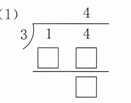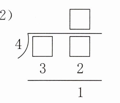 【解析】(1)先算出 4×3 = 12 写在被除式的下面,14 - 12 = 2,所以余数为 2。(2)想 4×8 = 32,所以商为 8,又知道余数为 1,所以被除数为 32 + 1 = 33。