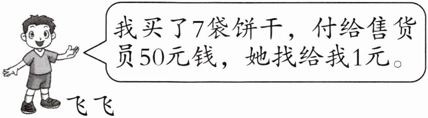 【解析】飞飞向售货员 50 元,售货员找给他 1 元,说明 7 袋饼干的总价是 50 - 1 = 49(元),所以把 49 平均分成 7 份,每一份的钱数就是每袋饼干的单价。