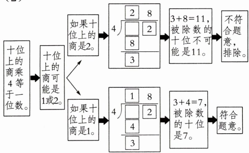 (2) 因为商个位数字$8$与除数$4$相乘是两位数,且余数为$3$,从$4×8 = 32$,$32+3 = 35$不符合,$4×9=36$,$36 + 3 = 39$不符合,$4×7 = 28$,$28+3 = 31$不符合,$4×2=8$,$8 + 3 = 11$不符合,$4×1 = 4$,$4+3 = 7$,所以先确定商个位是$2$,被除数个位是$8 + 3 = 1$不符合,$2×4 = 8$,$8+3 = 11$不符合,$3×4 = 12$,$12+3 = 15$不符合,$4×4=16$,$16 + 3 = 19$不符合,$5×4 = 20$,$20+3 = 23$不符合,$6×4 = 24$,$24+3 = 27$不符合,$7×4 = 28$,$28+3 = 31$不符合,$8×4 = 32$,$32+3 = 35$不符合,$9×4 = 36$,$36+3 = 39$不符合,只有$1×4=4$,$4 + 3 = 7$不符合,$0×4 = 0$,$0+3 = 3$不符合,而$4× 8=32$,$32+3 = 35$不符合,$4×9 = 36$,$36+3 = 39$不符合,$4× 7=28$,$28 + 3=31$不符合,只有$4×2 = 8$,$8+3 = 11$不符合,$4×1=4$,$4 + 3 = 7$不符合,所以商个位是$2$,被除数个位是$8×4 = 32$的$2$,十位是$3$;再看商的十位,因为十位上商乘除数$4$是一位数,所以十位上商可能是$1$或$2$,若十位上商是$2$,$2×4 = 8$,$8+3 = 11$不符合被除数十位是$3$,所以十位上商只能是$1$,$1×4 = 4$,$4+3 = 7$不符合,只有$1×4=4$,$3$作为余数落下来与个位的$2$组成$32$,$32÷4 = 8$,所以被除数十位是$7$,百位是$1$。