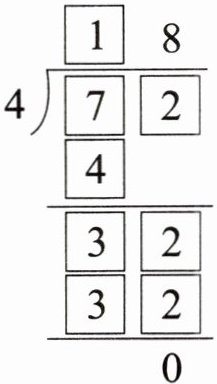 $\begin{array}{r} 18 \\ 4\overline{)72} \\ \underline{4} \\ 32 \\ \underline{32} \\ 0 \end{array}$