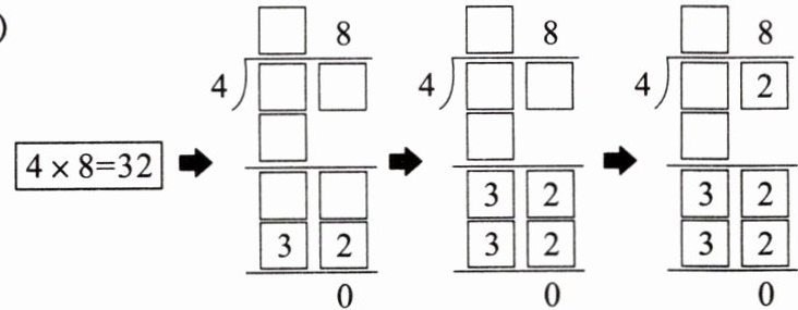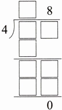 (1) 从商的个位数字$8$与除数$4$相乘得$32$,且余数为$0$,可推出被除数个位数字是$2$,十位数字是$3$;又因为商与除数相乘的积是两位数,所以商的十位数字是$1$,被除数的前两位是$4×1 = 4$再加上余数$3$($4×8 = 32$,$32$中$3$落下来),即$4 + 3 = 7$,所以被除数百位数字是$7$。