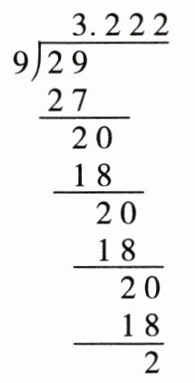 $\begin{array}{r}3.222\cdots\\9\overline{)29.000}\\27\\\hline20\\18\\\hline20\\18\\\hline20\\18\\\hline2\end{array}$