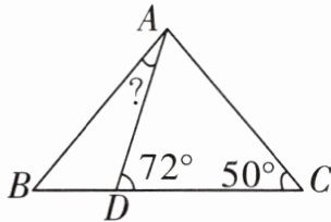 例2 在三角形ABC中,$AB = AC$,$∠C = 50^{\circ }$。在BC边上取一点D,已知$∠ADC = 72^{\circ }$,求$∠BAD$的度数。