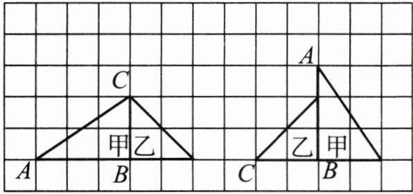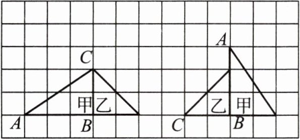 答案:先将左图整体向右平移6格,再将甲三角形绕B点顺时针旋转$90^\circ$,接着再将乙三角形绕B点逆时针旋转$90^\circ$,就可以得到右图。